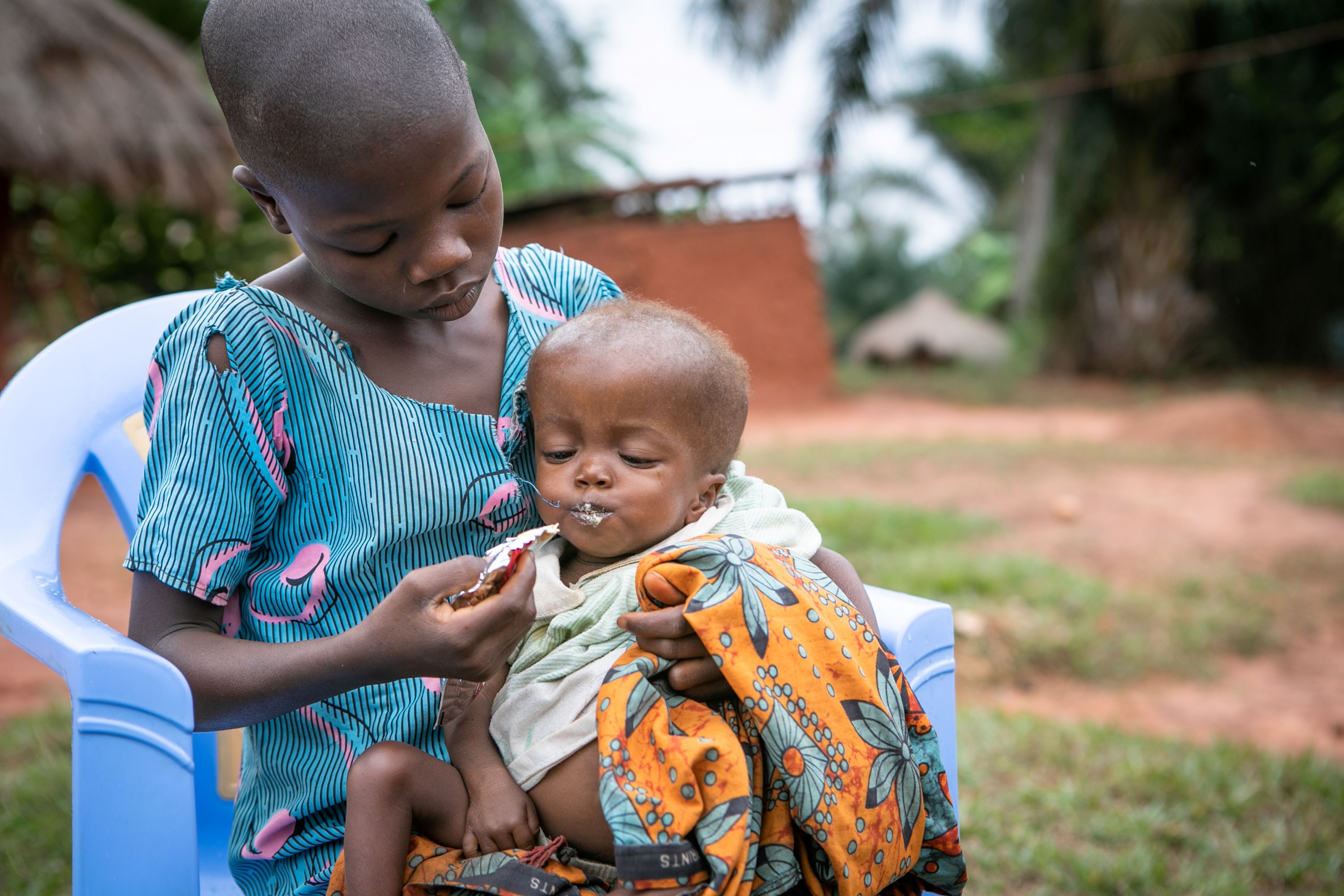 在我們的幫助下,Marie 親手餵弟弟Antho食高營養花生醬,幫助他補充急需的營養。
